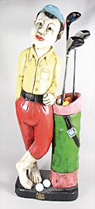 Figurur: läßiger "GOLFER", Holz, farbig bemahlt, im Köcher 3 Golfschläger u. diverse Golfbälle, H = ca. 100 cm, dekoratives Objekt !