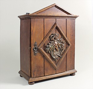 Kleines Hängeschränkchen, innen/unten 4 Schubladen, relieffiertes Metallbild: "KIND", das nicht essen will ! 4 kl. Füße, H = 41,0 cm, B = 29 cm, T = 16,5 cm