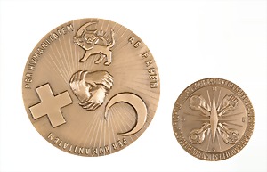Medaille, "ROTES KREUZ", Vorderseite: Rotes Kreuz, Halbmond… PER HUMANITATEM PER HUMANITATEM AD PACEM; RV: LEAGUE OF RED CROSSSOCIETIES LIGA DE SOCIEDADES DE LACRUZ ROJA:LIGUE DES SOCIETES DE LA CROIX ROUGE D = 67,7 mm