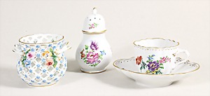 Lot: "DRESDEN" Porzellan, 1. Hälfte/Mitte 20.Jhd., 1 Tasse mit Untertasse; 1 durchbrochene Körbchen/Vase mit aufgesetzten Blüten; 1 Zuckerstreuer, H = 12,2 cm, Deckel verschraubt, polychrom bemahlt, Goldstaffaget, H = 14,7 cm