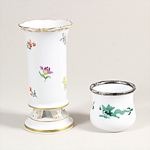 Lot: "MEISSEN" 1. Hälfte 20.Jhd., 1 kl. Vase, farbig bemalt, Silberrand, H = 57,5 mm; 1 Vase, "STREUBLÜMCHEN", 4 Füße auf Sockel, Goldstaffage, polygrom bemalt, H = 14,7 cm