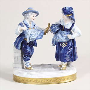 Figurengruppe, Verkäufer mit junger Dame, polychrom bemalt, Sockel mit Goldstaffage, H = 14,5 cm