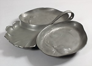 Dekorative Schale, "ORVIT" um 1890, Zinn, 3 Schalen sindmit zarten Blattmotiven gestaltet, dezent integrierter Griff, 3 Kugelfüße, ca. 32 x 28 cm, schöner Zustand !