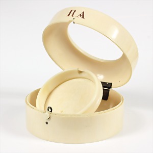 Uhrenschatulle für eine Taschenuhr, aus "ELFENBEIN" um 1900 gefertigt, Gehäuse mit sehr feiner Elfenbeinstruktur, handwerklich perfekt gearbeitet, Besitzermonogramm: RA, D = 82,0 mm, H = 44,8 mm, total 156,4 g, nicht verzogen ! (Deckeleinsatz fehlt) Für diesen Artikel ist ein Versand in nicht EU-Länder leider nicht möglich !