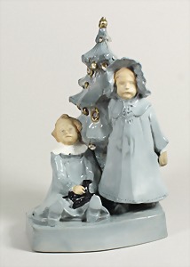 "Kinder unter dem Weihnachtsbaum", Majolika (K u. K Monarchie) um 1900/10, grau gebrannte Lasur mit goldfarbenen Akzenten, H = 32,0 cm, (kl. Chip an der Mütze), nächste Weihnachten kommt bestimmt !