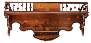 "JUGENDSTIL" Tellerregal von "GALLÉ" um 1900 (Gallé Emile Nancy 1846 - 1904), Intarisierte Mohnblüten u. Mohnkapseln, Material: Obst und Edelholz, Maße ca. B = 103 cm, H = 49,0 cm, T = 22,5 cm ! Markenkennzeichen: Galle (im Jugendstilschriftzug eingebunden), 3 gedrechselte Stäbe fehlen, altersbedingte Spannungsrisse !
