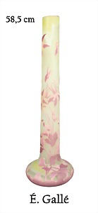 Große frühe Vase von "GALLÉ" um 1890/1900, Cameo-Technik, Klarglas, 3-facher Überfang in grün, hell -u. dkl. rosa Farbtönen. Akeleien und Blätter ziehen sich über den gesammten Glaskorpus, H = 58,5 cm, Fuß D = ca. 19,5 cm, ausgefallene Größe, Japanisierend signiert: Gallé, schöner unbeschädigter Original-Zustand !
