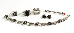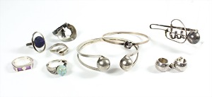 Eßbesteck 128 Teile, Silber 800/000, sig. Koch & Bergfeld (Symbol), Bremen, je 12 Dessertgabeln L = 19,7 cm, Dessertmesser L = 21,2 cm u. Dessertlöffel L = 19,0 cm; je 12 Gabeln L = 21,8 cm, Messer L = 21,2 cm u. Löffel L = 19,0 cm; 12 Kuchengabeln, L = 14,7 cm; 12 Kaffelöffel, L = 13 cm, 12 Eislöffel L = 14,5 cm; 3 versch. Vorlegegabeln; 3 versch. Vorlegelöffel L = 19.0 - 27,2 cm; 1 Soßenkelle; 1 Buttermesser; 11 Obstmesser L = 17,3 cm1 Torten/Kuchenheber, alles total 5,9 kg (davon Messer 1,65 kg)