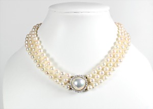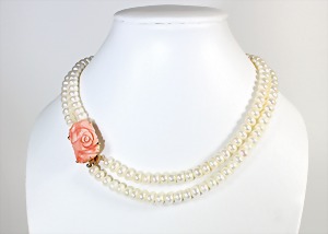 Korallencollier, GG 585/000, aus Koralle geschnittenes Damenportrait im Halbprofil ca. 36,6 x 44,5 mm, ca. 28,0 g schwer, eingerahmt von 52 Brillanten ca. 0,75 ct tw-vsi,rosafarbene Korallenkette (Pazifik), D = 8-8,3 mm, L = 42,5 cm mit 585/000 Kugel-Goldschließe. Mit einer zweiten Kette kann das Collier auch lang getragen werden, D = 8-8,3 mm, Schließe GG 585/000, L ca. 40,0 cm