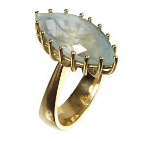 ring, yellow gold 750/000, blue topaz with navette cut c. 7.5 ct (20 x 9.5 mm), ring width c. 59, heavy worked ring shank, total c. 11.9 g.