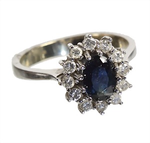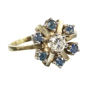 Ring, GG 585/00, zentraler Saphir ca. 0,5 ct, 10 Brillanten ca. 0,12 ct w-si (alle Steine weiß gefasst), RW ca. 44,5 (für den kleinen Finger !)