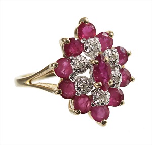 ring, yellow gold 585/000, 6 pieces 8/8 diamonds white, white set, 11 rubies (faceted), ring width c. 55 (from a liquidation)