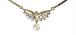 Collier, GG 585/000, abgehängte Akoja-Perle, 9 St. 8-kant Diamanten weiß, kl. Kastenschloss mit Sicherheitsacht, L = ca. 41,0 cm, total 7,4 g