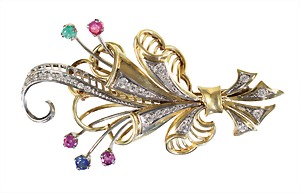 brooch, stylized cornucopia, yellow gold/white gold 585/000, 11 brilliants c. 0.30 ct tw-vsi/si, 17 pieces 8/8 diamonds c. 0.22 ct white (all white set), 3 rubies, 1 sapphire and 1 emerald, all faceted, c. 60.2 x 34.5 mm