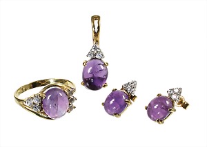 lot amethyst jewelry:, yellow gold 333/000, white stones, 1 ring, ring width c. 58.5 (shank must be soldered!), 1 pendant height = 25.7 mm (loop can be open), a pair of studs, height = 13.7 mm