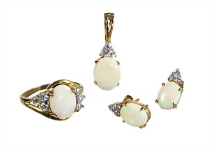 lot opal jewelry:, yellow gold 333/000, white stones, 1 ring, ring width c. 56.5 (shank must be soldered!), 1 pendants height = 25.4 mm (loop can be open), a pair of studs, height = 13.7 mm, all jewelry are made with Australian white opals!