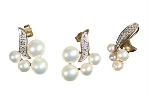 lot bead jewelry: yellow gold 333/000, freshwater pearls with white stones, a pair of studs height = 19,7, one pendant height = 19.7 mm (loop can be open)