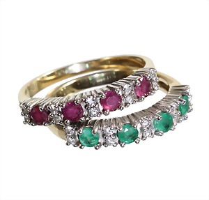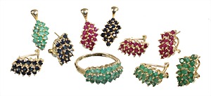 Lot: GG 585/000, diverse Schmuckstücke ausgefasst mit Rubinen, Saphiren u. Smaragden (facettiert), eine Garnitur Ohrclips (mit Steckern) H = 15,5 mm u. 1 Garnitur Anhänger, H = 21,6 mm; 1 Ring mit 25 Smaragden, RW ca. 56, total 18,1 g