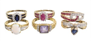 lot: rings (6 pieces):, yellow gold 333/000, 1 opal ring, 2 sapphire rings, 1 amethyst ring and 2 ruby rings, all jeweled with white stones, ring width c. 54.5 - 57, total 15.6 g