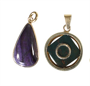 Lot: 2 Anhänger, GG 750/000, 1 Anhänger, Sugelit-Tropfen, H = 42,0 mm; 1 Anhänger, KREIS-QUADRAT, Heliotrop, D = 28,0 mm, (graviert: CLE), total 17,8 g