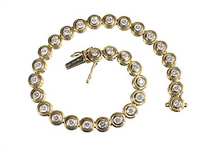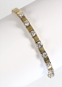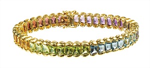 Armband REGENBOGEN von "H.STERN" (Brasilien), GG 750/000, sig. S (Stern), 74 Granate, Citrine, Peridots, Blautopase, Iolite u. Amethyste, facettiert (in Trapez-Form geschliffen) und im Farbverlauf angeordnet, total 22,74 ct, integriertes Kastenschloss mit 2 Sicherheitsachten, B = 9,1 mm, L = 18,3 cm, sehr anschmiegsam, total 32,6 g, nahezu ungetragen !