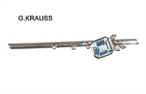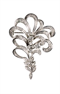brooch, white gold 750/000 (checked), 2 old cut-diamonds c. 0.45 ct white, 4 brilliants c. 0.10 ct white-si/p, 45 parts 8/8 diamonds, c. 34.8 x 48.4 mm, total 9.7 g