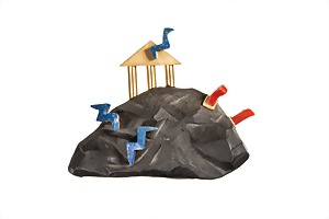 unusual designer jewelry, 1 brooch, silver 925/000, signed with a elephant, green-yellow marbling color: (behind glass), stylized arms with stone balls as hands, cut figures from a fable made of stone, accentuated inset stones, hanging chrysoprasedrop, brooch: c. 81.0 x 11.5 cm, 1 ring with mother-of-pearl blossom, ring width c. 58, a curious ensemble !