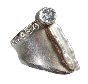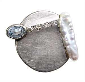 ring, silver (checked), 1 aquamarine c. 8 x 5.5 mm, elongated freshwater pearl, 7 brilliants c. 0.16 ct white, ring width c. 55.5