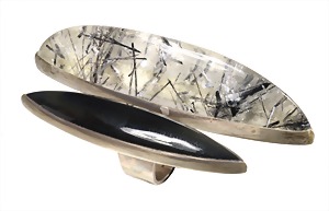 Designer-Ring, Silber 925/000, großer Quarz mit Rutileinschlüssen (schwarze Turmalinnadeln) im Navette-Schliff, ca. 80,0 x 14,5 mm, 1 Onyx in Navette-Form, RW ca. 53/54