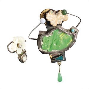 Ausgefallener Designerschmuck, 1 Brosche, Silber 925/000, sig mit einem Elefanten, grüngelb marmorierte Farbe (hinter Glas), stilisierte Arme mit Steinkugeln als Hände, geschnittenes Fabelwesen aus Stein, akzentuiert eingesetzte Steine, abgehängter Chrysoprastropfen, Brosche: ca. 81,0 x 11,5 cm; 1 Ring mit Perlmuttblüte, RW ca. 58. Ein skuriles Ensemble !