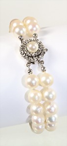 pearl bracelet (two rows), clasp: white gold 585/000, integrated box clasp with safety device, 2 Akoya pearl strings, Akoya pearls with a diameter = c. 7.5 - 8.0 mm, lenght = c. 19.5 cm, nice luster !