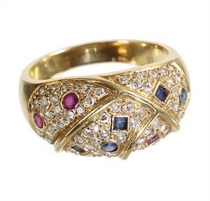 Ring, GG 750/000, 8 Saphire u. Rubine in Rund- u. Carré-Schliff, 61 Brillanten ca. 0,50 ct tw/w-vsi/si, RW ca. 57