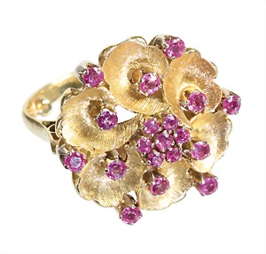 Ring, GG 585/000, zentral stilisierte Blüte mit 7 kl. Rubinen, umfasst von zwei weiteren Rubinkränzen, alle zusammen ca. 0,7 ct, RW ca. 54 (2 kl. Kugeln innen !)