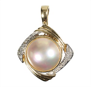 Anhänger, GG 585/000, Mabe-Perle D = ca. 14,3 mm, 22 Brillanten ca. 0,15 ct weiß, Aufhängung mit Klappmechanismus, H = 32,7 mm