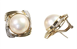 1 Paar Ohrclips (mit Stift), GG 585/000, Mabe-Perle D = ca. 14,3 mm, 44 Brillanten ca. 0,30 ct weiß, ca. 19,3 x 19,3 mm