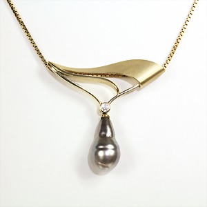 Collier, GG 585/000, Mittelteil mit Brillant ca. 0,10 ct tw-vsi u.1 Tahiti-Perltropfen (H = ca. 20,0 mm); Venezia-Kette, GG 585/000, L = 43,8 cm, total 16,2 g