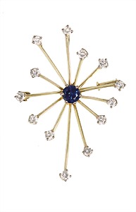 brooch, yellow gold 750/000, central sapphire c. 0,80 ct, 13 brilliants c. 0,60 ct tw-vsi (white set), c. 31.0 x 43.0 mm, can also wonr as pendant!!