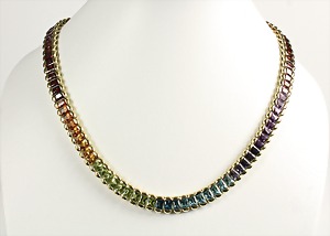 necklace rainbow by "H.STERN" (Brazil), yellow gold 750/000, signed S (Stern), 102 garnets, citrines, peridots, blue topazs, iolites and amethysts, faceted (trapezoid cut) and arranged according to the color gradient , total 53.07 ct, integrated box clasp with 2 safety catches, width = 9.0 mm, lenght = 43.3 cm, very soft and smooth, total 59.2 g, almost unworn !