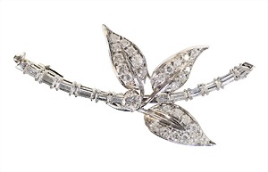 Brosche BLATT, komplett mit Diamanten ausgefasst ! WG 750/000, 29 Brillanten ca. 0,55 ct tw-vsi, 11 Diamanten im Baguette-Schliff u. 1 Diamant im Trapez-Schliff, total ca. 0,66 ct tw-vvsi, Brosche ca. 47,3 x 23,7 mm.
