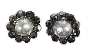 a pair of ear clips, metal (gold colored), signed HASKEL (Miriam), grey hemispheres with textured surface, in the garland hematite-colored faceted balls, diameter = 35.0 mm