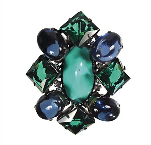 Dekorative Brosche "SCHREINER" New York, Metall (geschwärzt), zentral: türkisfarbener Stein, im Kranz abwechselnd grüne facettierte u. blaue Glascabochons, ca. 53,8 x 64,5 mm