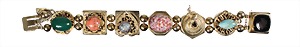 Armband, goldfarben, sig. REINAD 5 TH AV. N.Y. (New York), graphische Elemente mit farbigen Glassteinen u. ausgefallenen Applikationen, integriertes Kastenschloss mit Sicherheitskettchen, L = 19,0 cm