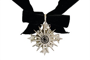 Samt-Halsband mit Schleife, "YVES SAINT LAURENT", weißes Metall, sig. YSL, dekorativer Stern mit vorwiegend farblosem Strassbesatz, zentral: im Kreis angeordnete schwarze Glassteine,. Der Stern sitzt auf einer quadratischen Platte mit vier weiteren ausgefassten Sternen, D = 68,2 mm, Samtband mit Verlängerungskettchen (eng am Hals zu Tragen) L = 36,0 - 41,5 cm