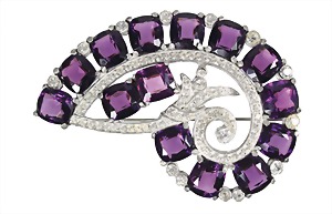 brooch, stylized snail, white metal, signed Eisenberg original, helical arranged, amethyst-colored rhinestones, white rhinestone in line and dot-like accentuated, c. 85.0 x 63.2 mm