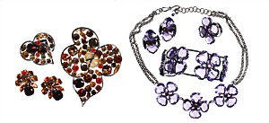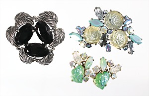 Lot Modeschmuck "VINTAGE" USA 1950er Jahre, signiert SCHIAPARELLI, 1 Brosche, weißes Metall, zentral 3 große facettierte Glassteine, umlaufend plastisch ausgearbeitete Blätter, D = ca. 57,0 mm; 1 Brosche, weißes Metall, zentral 3 große transparente Glassteine in Form von Blüten, türkisfarbene u. opalisierende Glassteine, L = ca. 58,0 x 55,0 mm; 1 Paar Ohrclips, goldfarbenes Metall, strukturierte u. opalisierende Glassteine, 24,5 x 30,5 mm