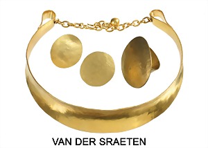 lot: "VINTAGE" 1980s/'90s necklace, studs and ring, signed VAN DER STRAETEN, brass 24 carat gilded, hammered surface, necklace, slightly edged, in front: width = 25.0 mm, studs diameter = 30.0 mm, ring, ring head c. 43.5 x 34.0 mm, ring width c. 56 (adjustable)