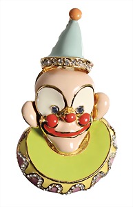 Brosche, "CLOWN", goldfarben, unsig., farbenfrohes Emaille, plastisch ausgeformt, klarer Strass, H = 59,2 mm, schöner Zustand !