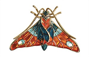 Dekorative Brosche, in Form eines FALTERS, goldfarben, unsig., Flügel mit feinem Muster, in Orange- und Petroltönen emailliert, ca. 69,5 x 44,2 mm
