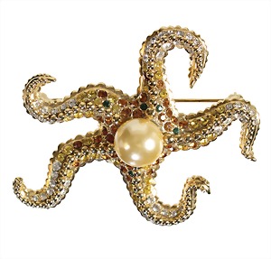 decorative brooch, stylized octopus, gold colored, unsigned, plastic formed, luxuriant studded with rhinestones in white, yellow, cognac and green color shades, completed by a central artificial pearl! c. 63.0 x 47.5 mm