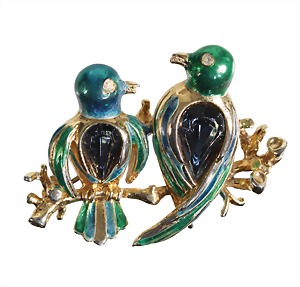 figured brooch, two birds on a branch, gold colored, signed CRAFT, plastic formed blue-green enamel layer, always a drop-shaped polished blue glass stone, c. 44.0 x 32.0 mm